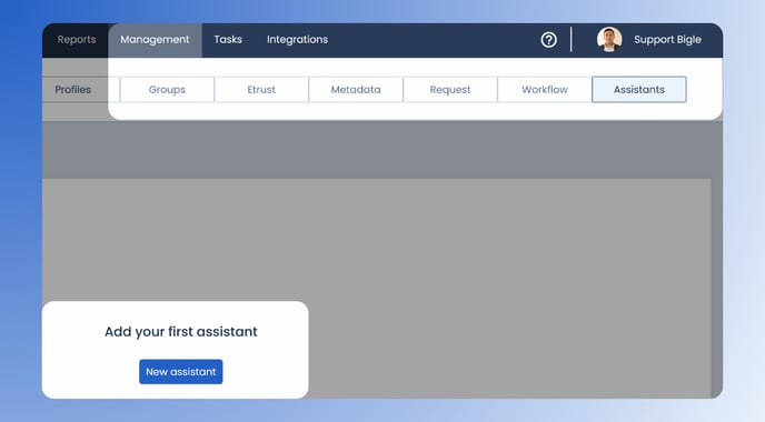 - Click on the Assistants tab (located to the right of the submenu bar). Here you will see the list of existing assistants, with options to duplicate or delete them.