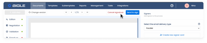 - Pending: the document has not been sent for signature yet. When the process is in this stage, you can still delete it without the need for the signers to be notified by clicking ‘Cancel signature’ at the top of the document environment.