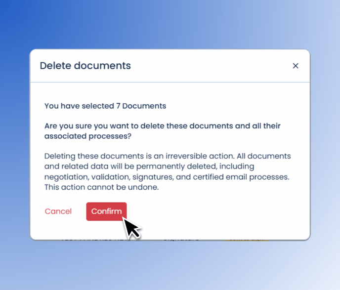 - To delete them, click "Delete documents" and, after making sure you want to do it (remember that this is an irreversible action), press "Confirm".