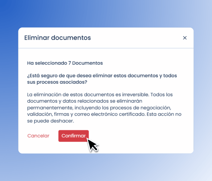 - Para eliminarlos, haz clic en “Eliminar documentos” y, después de asegurarte de que deseas hacerlo (recuerda que se trata de una acción irreversible), haz clic en “Confirmar”.