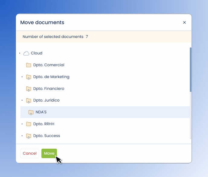 - Para moverlos, haz clic en “Mover documentos”, selecciona la carpeta de destino y haz clic en “Mover” para confirmarlo.