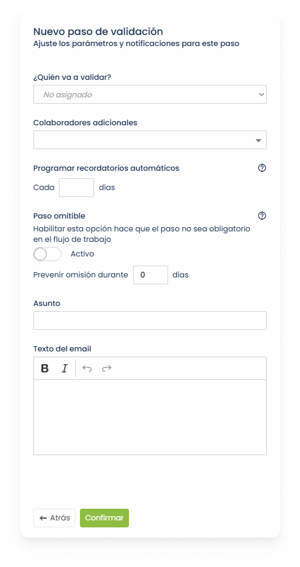 - Programar recordatorios automáticos cada un número de días concreto que escojas, para recordar a los validadores que deben llevar a cabo la validación.