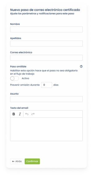 Añadir un paso de email certificado al workflow te permitirá ajustar distintos parámetros y notificaciones: